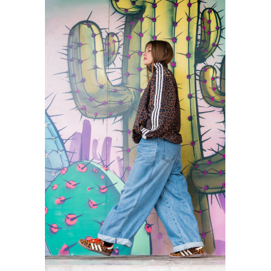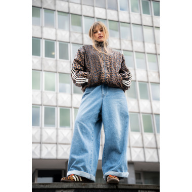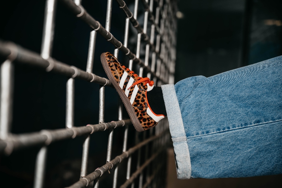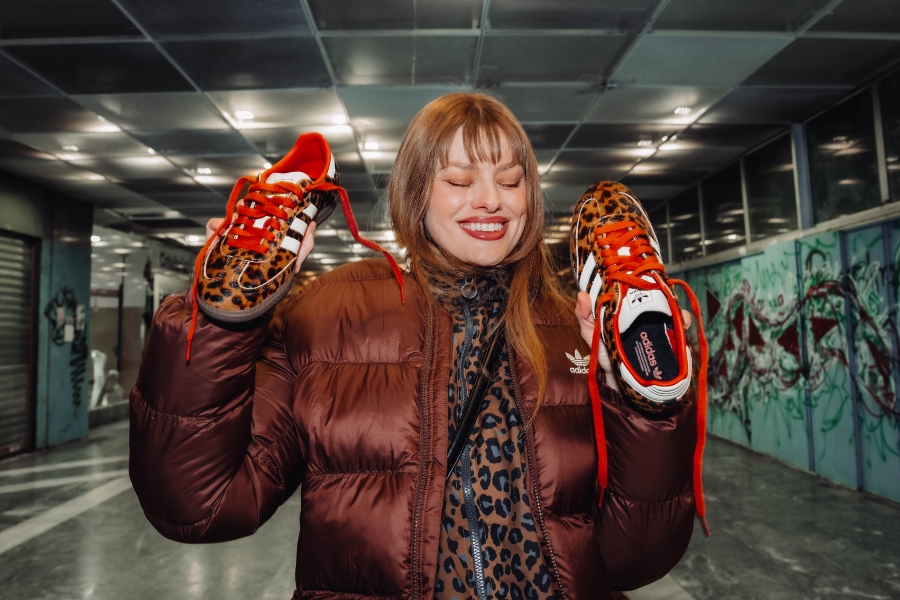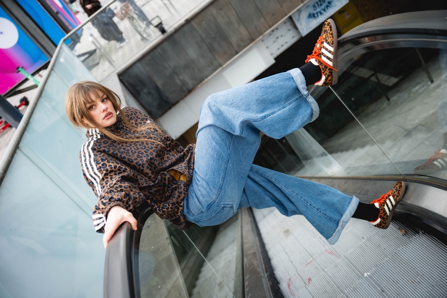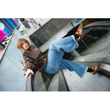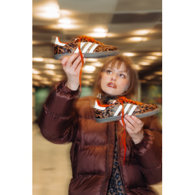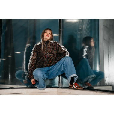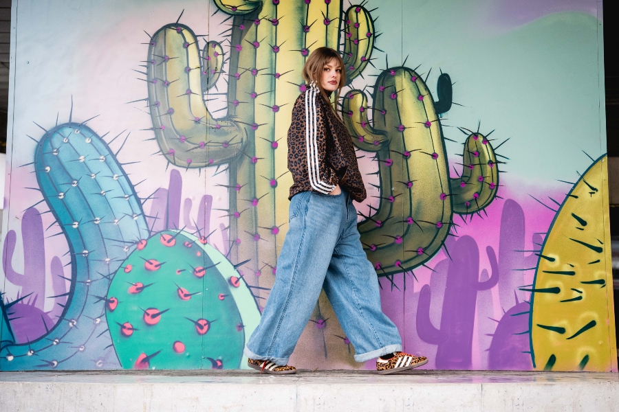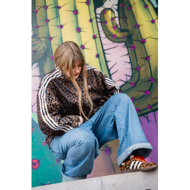 Dodam še statement jakno, v tem primeru leopardji vzorec, ki outfitu doda karakter in malo drznosti. Zraven gre preprost top ali pulover – brez kompliciranja. Samba OG v takem outfitu delujejo kot ravno prav umirjen kontrast vsem močnejšim kosom.
