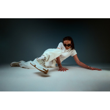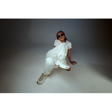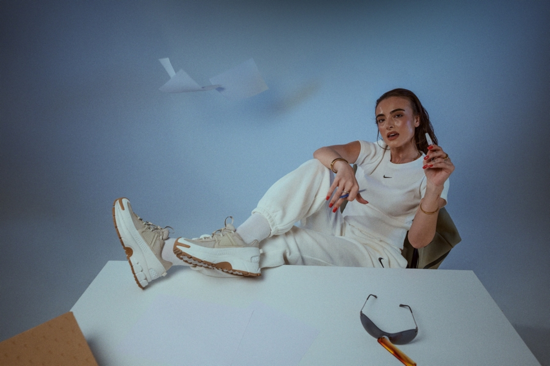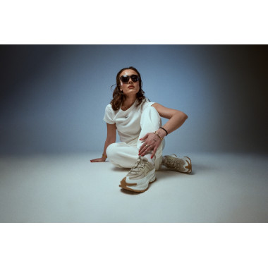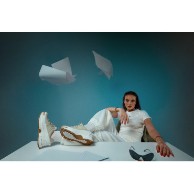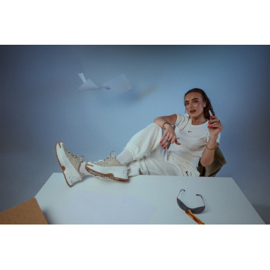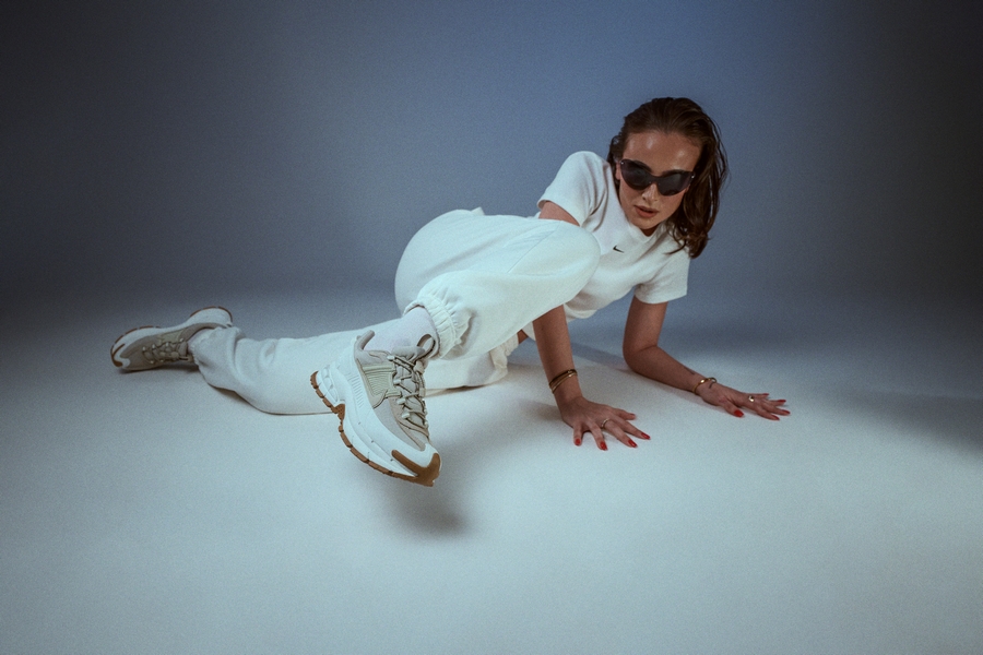 Studio nam je dal prostor za igro s pozami, svetlobo in gibanjem. Majhna miza ni bila le rekvizit, ampak kontrast — delovni moment, prepleten z modno energijo. Prav tukaj NIKE ZOOM VOMERO ROAM pokažejo, kako prilagodljive so: od aktivnega dne do premišljenega outfita, brez da bi pri tem izgubile svoj značaj.